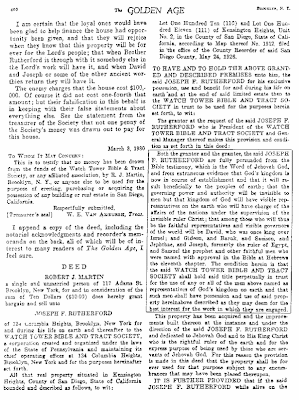 Rutherford’s career was a parody (if it is possible to parody such things) of the extremist political tendencies of the era. When he died in 1942 at his San Diego residence - an estate intended as the capital of the resurrected patriarchs’ millennial regime, but equipped, for the present, with secret shelters against enemy attack - it was obvious that he had outlived his time. In ensuing years, the Watchtower Society learned to behave less like a political cult and more like a modern corporation - while retaining most of Rutherford’s doctrines and all of his authority.